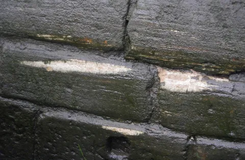 Photo: Scarring on the wall of lock 40 where it is out of true.
