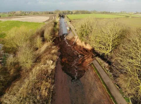 1) A small section of the Southern side of the Shropshire Union canal bank immediately East of the aqueduct failed and collapsed into the canal due to its poor/weak condition.