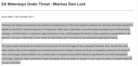 “Notorious for being connected by the system's smallest lock (47 ft) to the system's leakiest cut, this lock has been closed by stealth by the EA for several years by a “temporary” coffer dam, ostensibly to prevent water seepage, but in fact severing passage, of which there is a statutory right enshrined in law. Unfortunately EA denies it has a statutory responsibility to fix the lock, and even if they did, it’s too costly for the limited use in the current circumstances regarding funding.