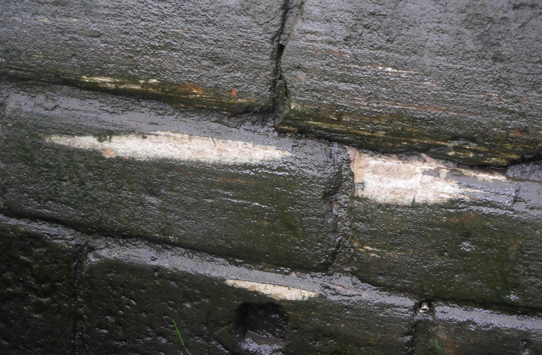 Photo: Scarring on the wall of lock 40 where it is out of true.