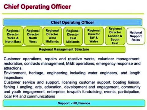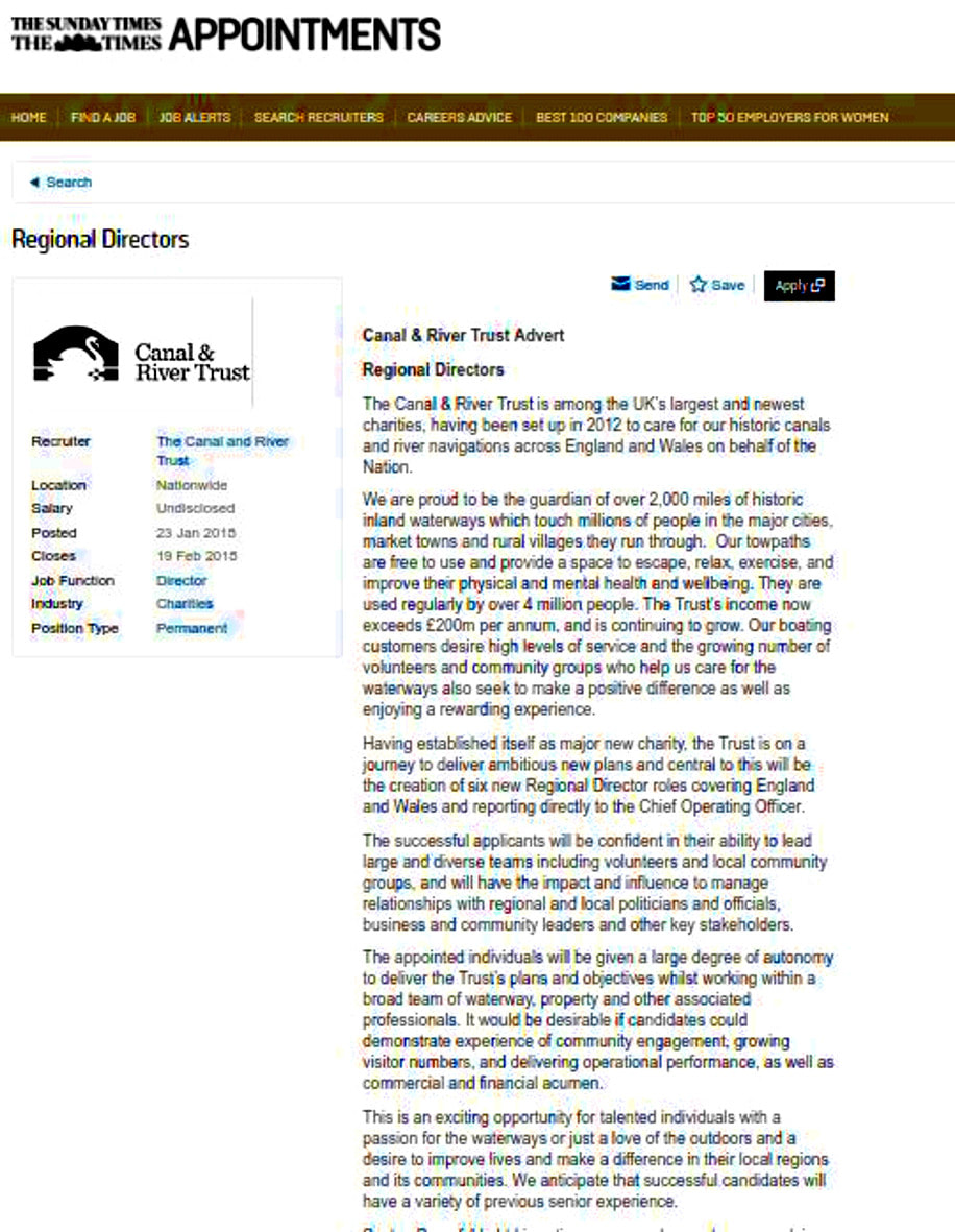 The advertisment goes on to say: ‘The regional structure is made up of six large waterways across England & Wales. The six Regional Directors will lead on all aspects of volunteering, engagement, education, local fundraising, events, restoration, communications, licensing and attractions and will manage the contracts which are critical to ensure excellence in customer service. The new regions will strengthen the Trust’s ability to deliver customer service and build reach, awareness and support, and to provide the opportunity for the Trust to maximize the breadth of public good that it achieves.’