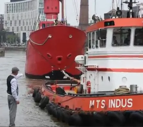 When the ship was towed away in September last year Mr Roberts was filmed climbing over railings at Canning Dock East.