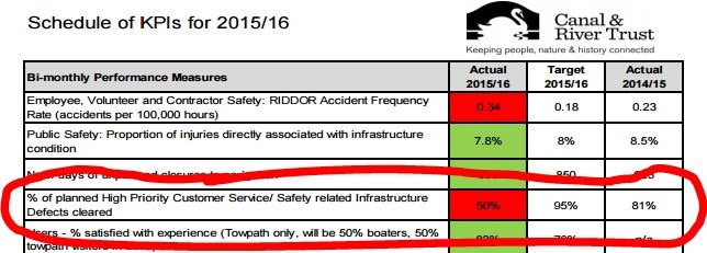 Some months back, The Floater described how C&RT had failed to meet its most important maintenance target for the 2015/16 financial year. At the beginning of the year (April 1 2015), the Trust had some 59,133 recorded defects on its 2,000 miles of waterways (up from 50,579 the previous year).