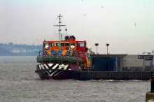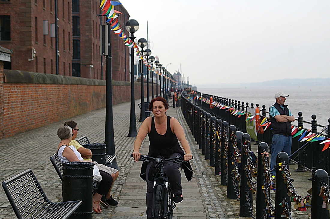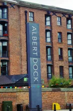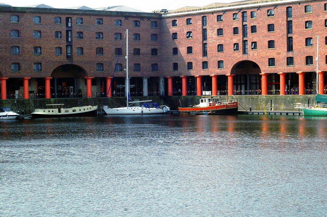 Photos: (1st) Inside the Albert Dock, (2nd) The old warehouses are now hotels, shops and apartments, (3rd) The iconic Mersey Ferry on the waterfront, (4th) The waterfront as seen by an artist and displayed in the Museum of Liverpool, (5th & 6th) A narrowboat passing through the Liverpool Link by the Three Graces, (7th) The water's edge separating the Albert Dock from the River Mersey.