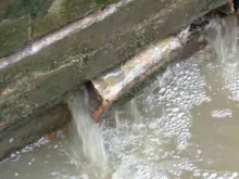 Unfortunately, below the repair there is projecting brickwork that could snag a boat causing it to hang up and sink. Why was this not fixed? ... and why is so much water pouring from the hole in the lock wall?
