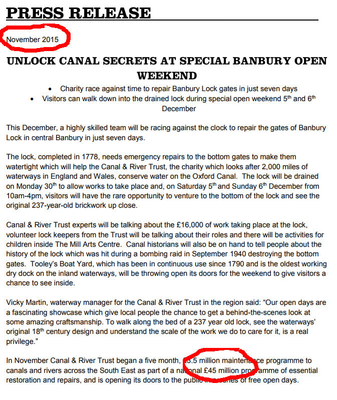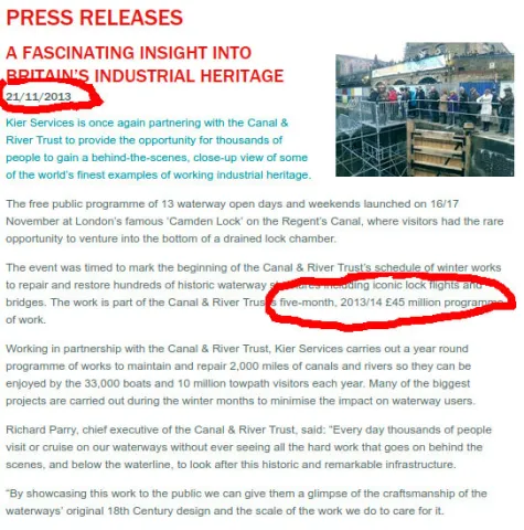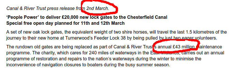 The programme is,of course, better known to boaters as 'Winter Works' which entails a series of planned stoppages. There is nothing new in this type of press release and it seems aimed more at impressing the general public - who are invariably invited to inspect drained lock chambers - with the amount of money C&RT spends on maintaining its waterways. Indeed, similar press releases, both local and national, are made each year, always quoting the amount spent over the five month winter works period
