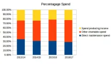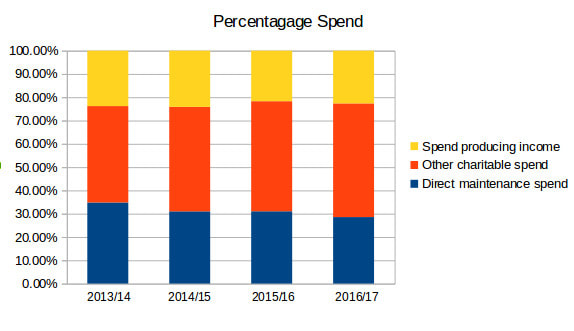 The problem with this is that, whilst it can be seen that the four categories marked with an asterisk directly relate to maintenance of C&RT's waterways and the ability of boats to use them, some other categories have a portion of spend that is indirectly related but can not be separated out. For example, operational buildings are used both by staff who maintain the waterways and those who have different functions. However, the Trust provides no split.