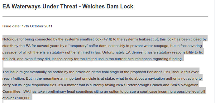 It took some five years for IWA to get its ducks in a row and actually respond to the Welches Dam Lock closure. On 17 October 2011 it posted on its website under a title of 'EA Waterways Under Threat - Welches Dam Lock' the following -